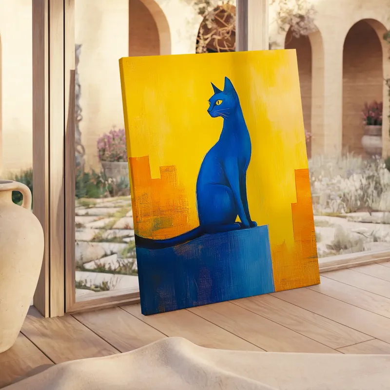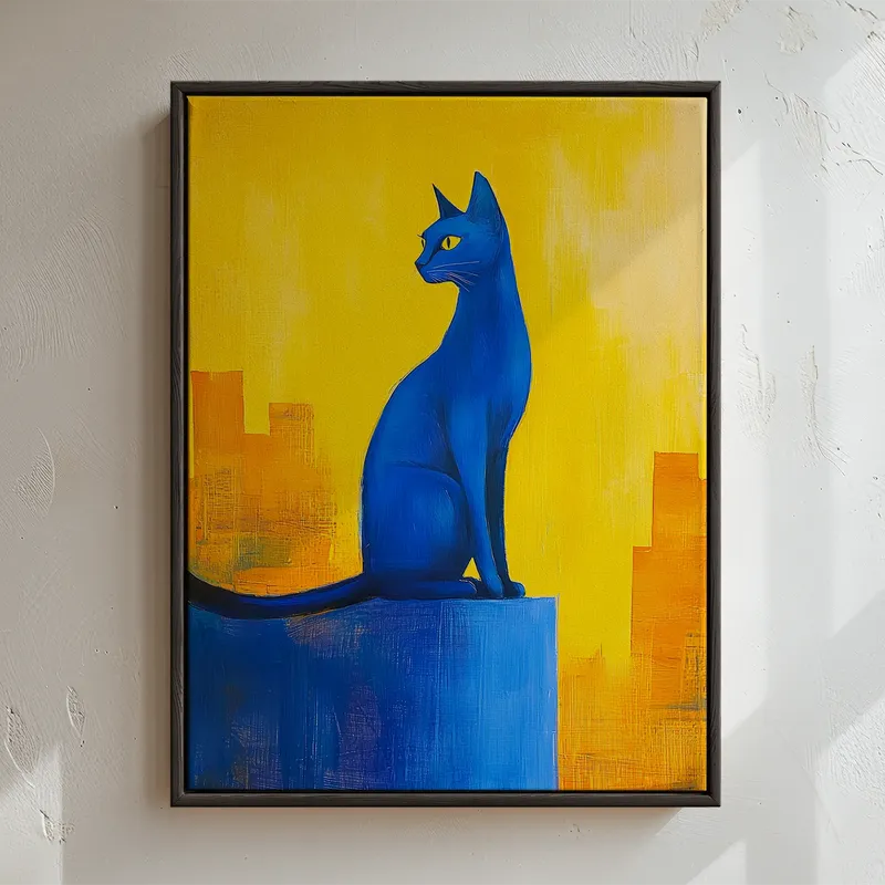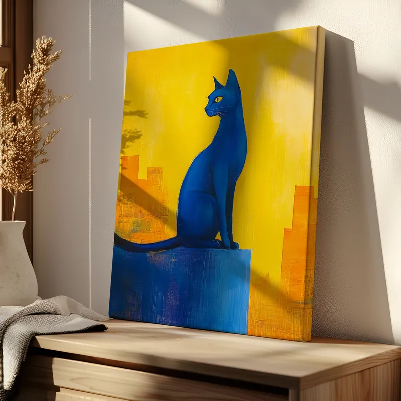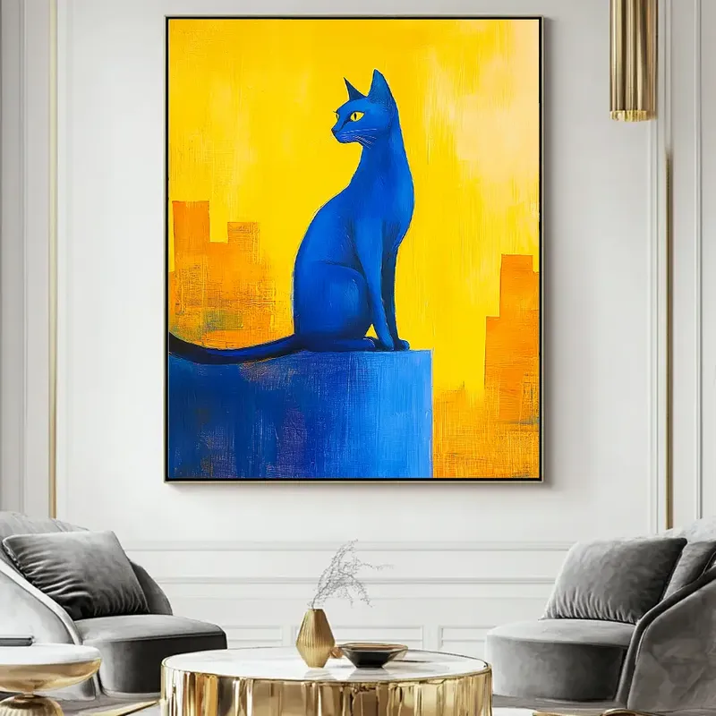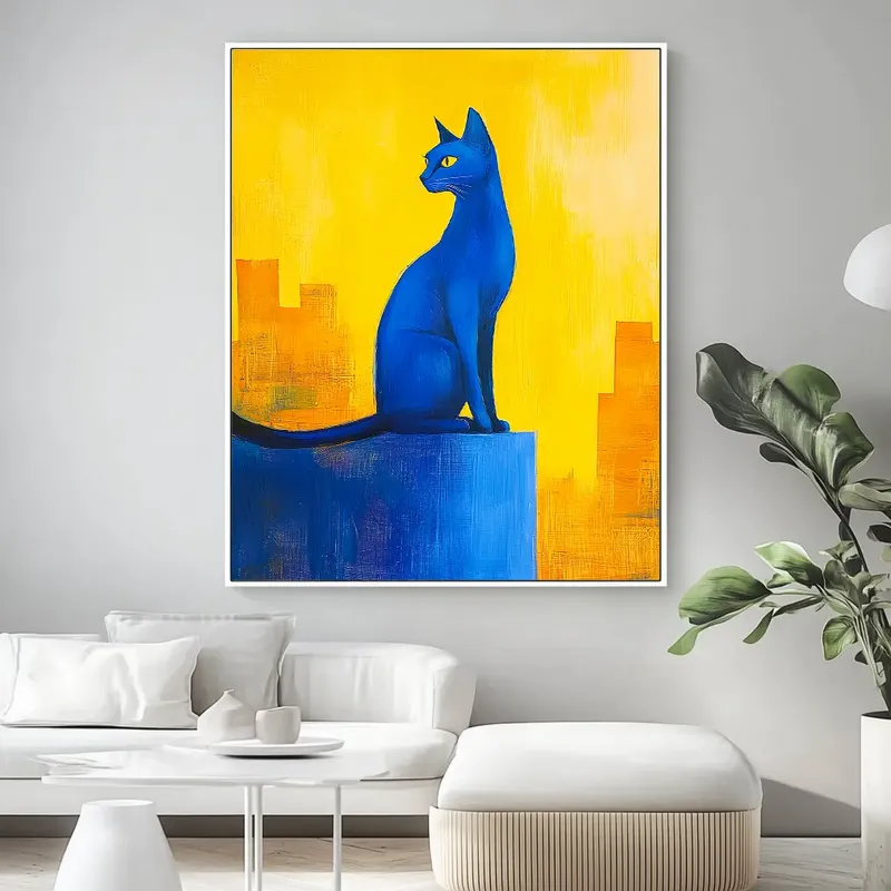 Bright colors fill this delightful art piece, showcasing a blue cat amidst vibrant hues. This cat wall art captures the playful spirit of feline friends, making it perfect for animal lovers. The abstract canvas design adds a modern touch to your space, bringing colorful decor that brings warmth and joy to any room. Perfect for a living room or bedroom, this artwork makes a bold statement, creating a joyful atmosphere. Each piece is made with gallery-wrapped canvas and fade-resistant inks, ensuring long-lasting beauty. Ready to hang, this European handmade art will elevate your home style.