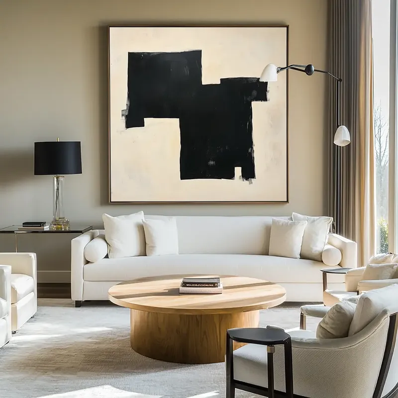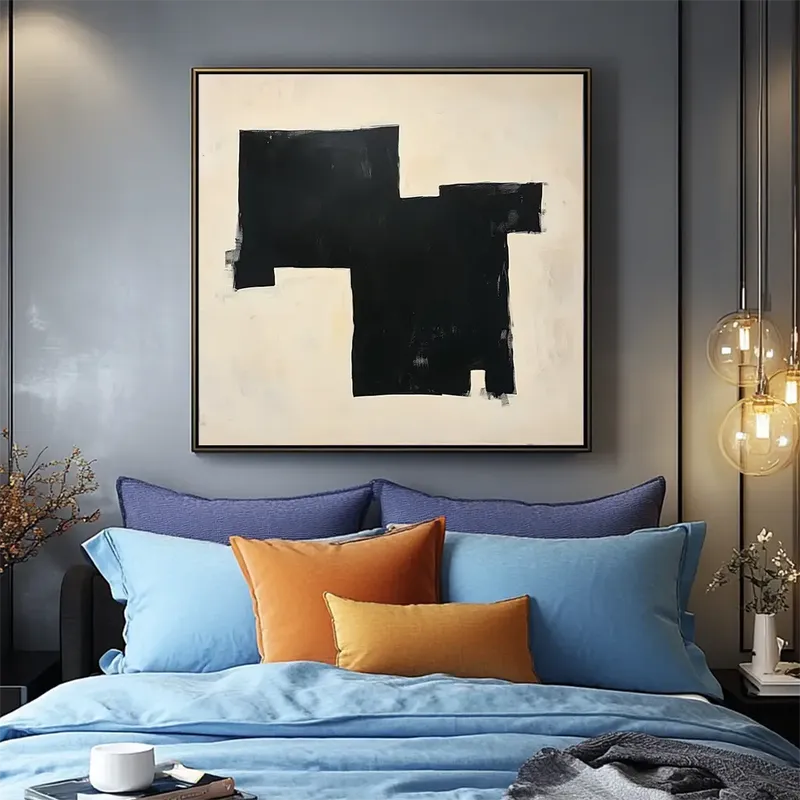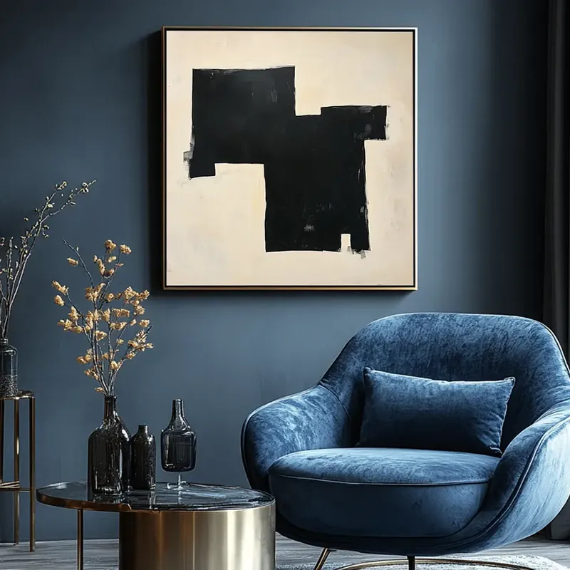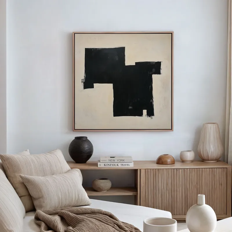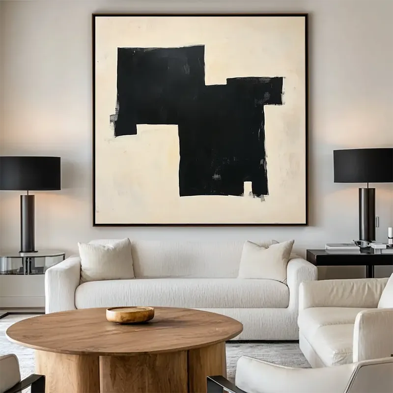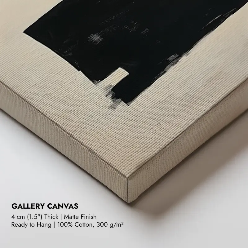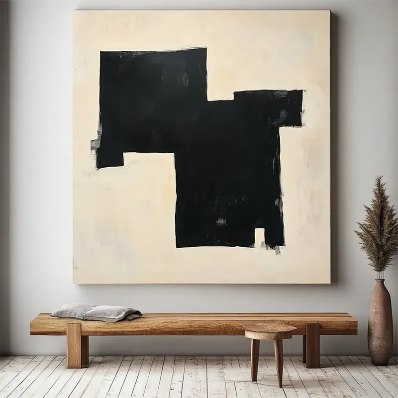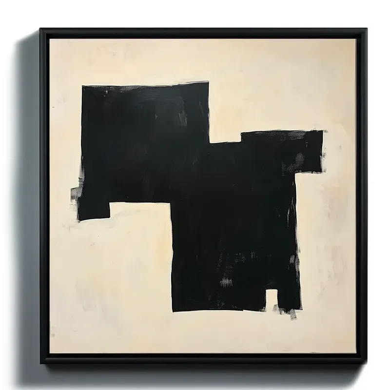 Bold shapes dominate the canvas, creating an intriguing visual contrast with a soft beige background. This piece showcases a powerful black abstract design that captivates the viewer’s attention. Ideal for modern aesthetics, this art adds a unique flair to any space. It’s perfect for settings like a living room, office, or contemporary dining area, offering a touch of sophistication and style. Crafted on gallery-wrapped canvas with fade-resistant inks, it’s ready to hang and elevate your interiors. Made in Europe with utmost care, this minimalist decor piece is tailored for those who appreciate simplicity and depth in their surroundings.
