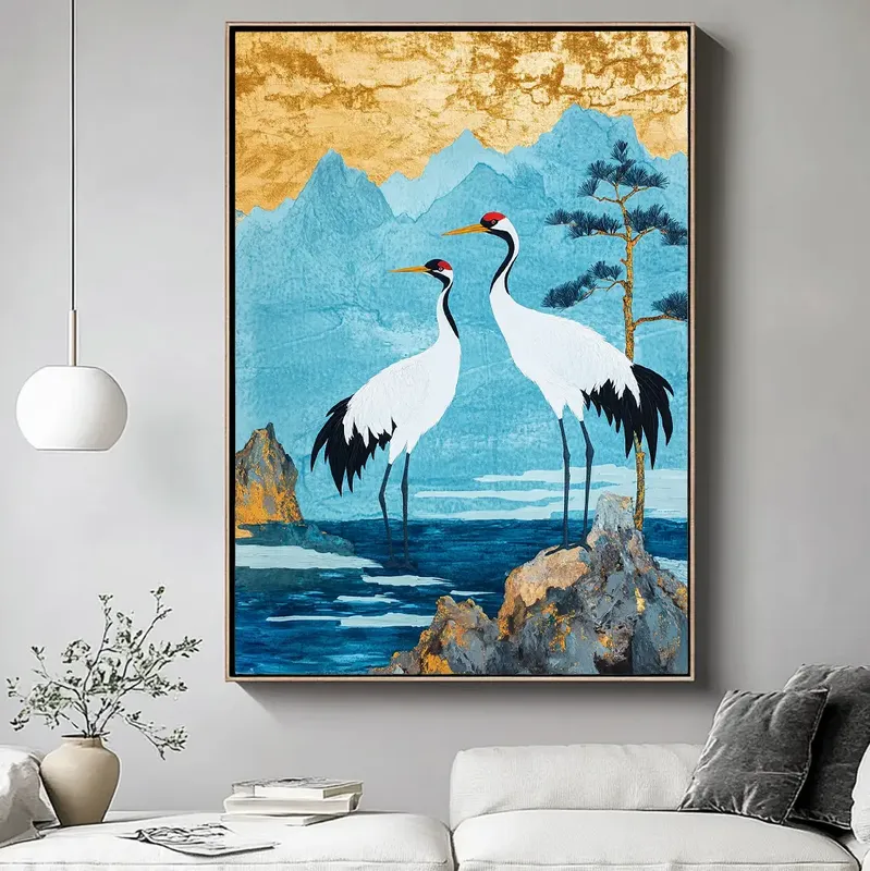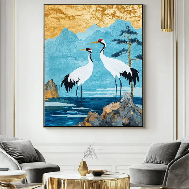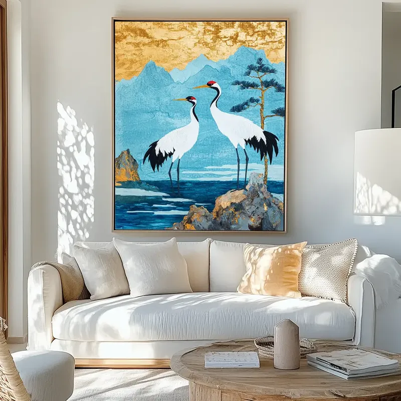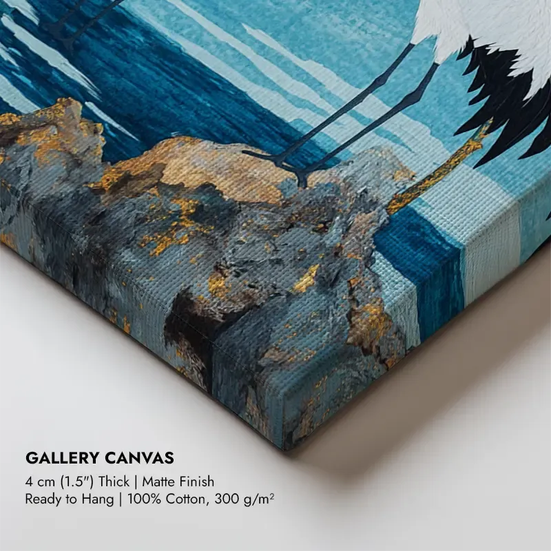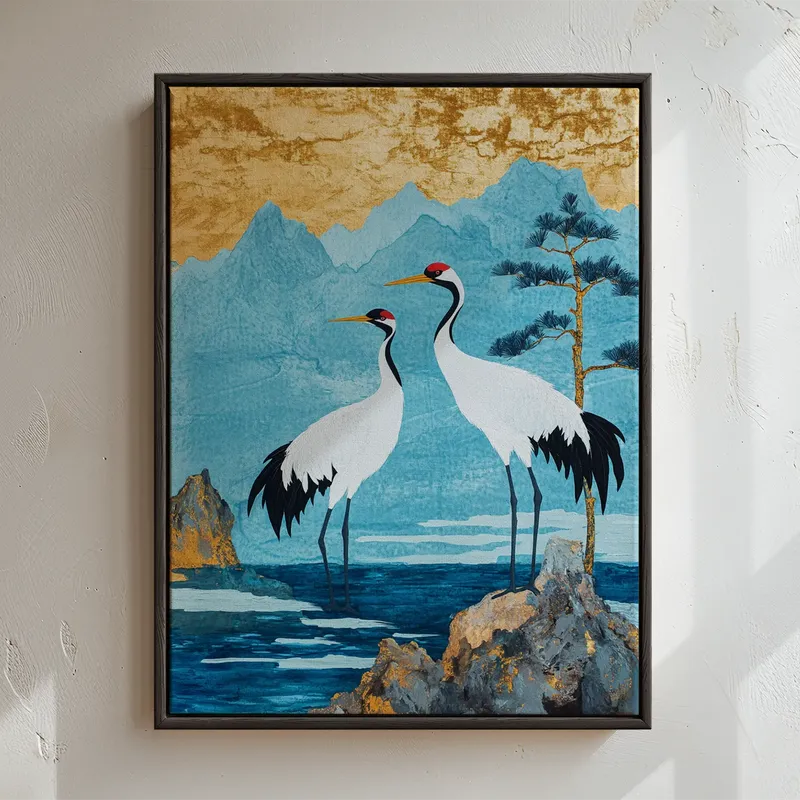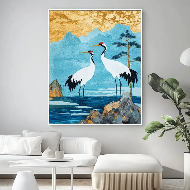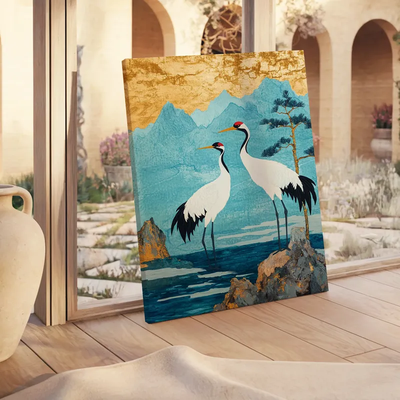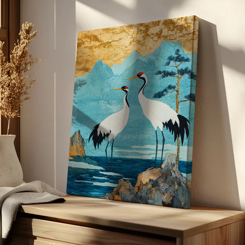 Serene colors fill this stunning artwork showcasing two elegant cranes standing gracefully by water. The lively blue tones, combined with touches of gold, create a peaceful atmosphere perfect for tranquil spaces. This crane wall art serves as an ideal addition for those seeking a calming influence in their home. Elegant cranes are beautifully drawn, with their bright white bodies contrasting against the soft, rich background. This oriental canvas is crafted to bring a sense of serenity into your living room, bedroom, or office. The artwork is printed on a gallery-wrapped canvas and features fade-resistant inks, ensuring lasting beauty. Bring a touch of nature’s harmony into your space – ready to hang and enjoyed by everyone.