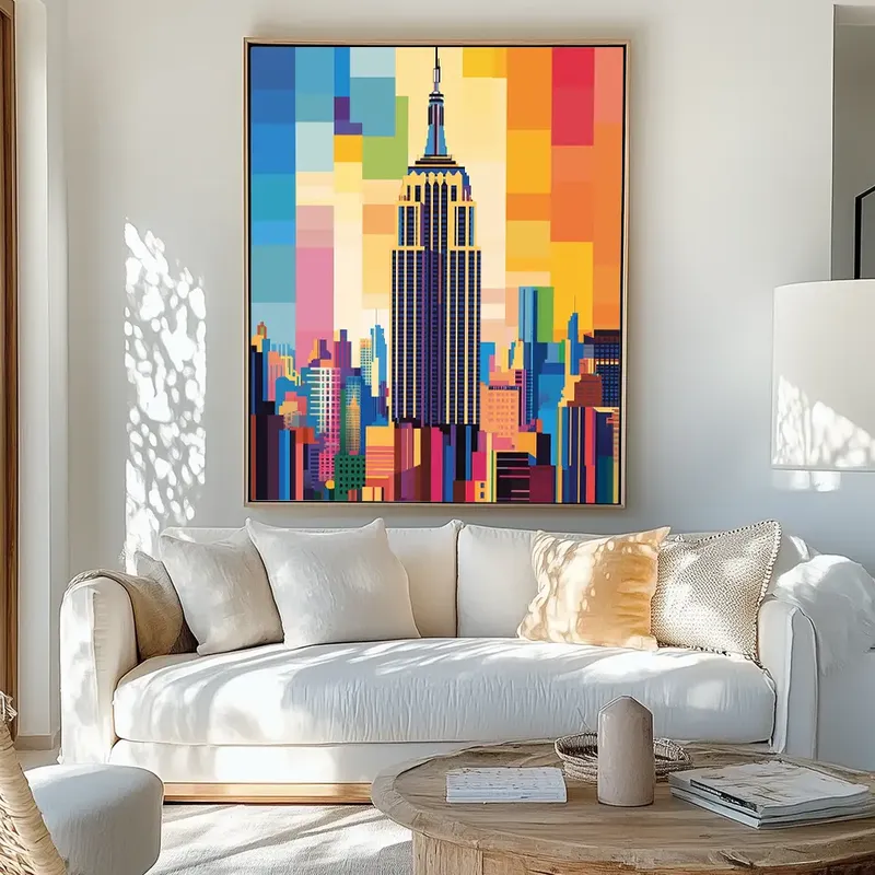Bold colors illuminate the Empire State Building in this stunning art piece. This Empire State Building wall art captures the energy of New York City with its vibrant hues and abstract forms. Perfect for those who appreciate modern art, this abstract canvas brings a lively atmosphere to any space. Ideal for vibrant decor, this artwork adds a splash of energy to your living room, office, or bedroom. Soft shapes and colors create an inviting vibe, making your walls come alive. Each piece is handmade using gallery-wrapped canvas and fade-resistant inks to ensure long-lasting beauty. Experience the dynamic feel of a colorful city art piece that welcomes guests and creates an inviting focal point. Ready to hang and perfect for enhancing your home decor.