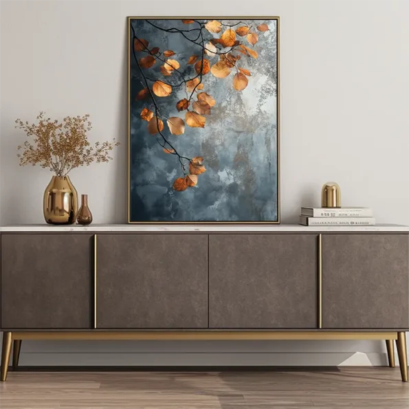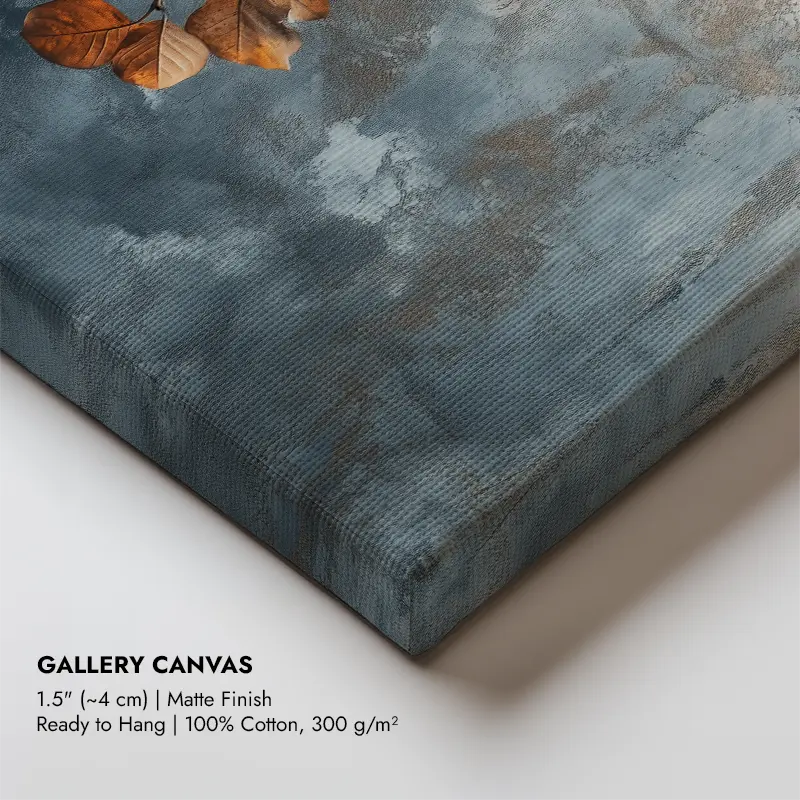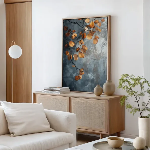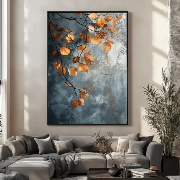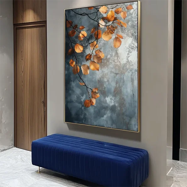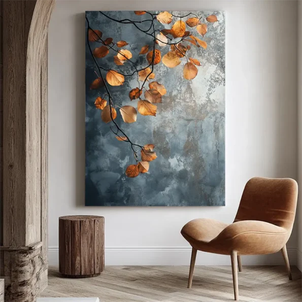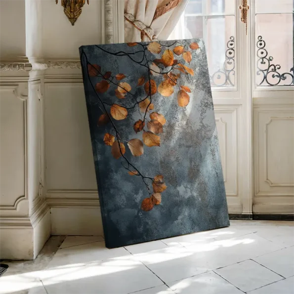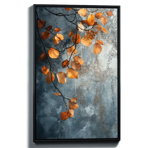 Soft light brings the warmth of autumn with beautiful golden and orange leaves in this art piece. Set against a calming blue background, this artwork captures the essence of nature in detail. Perfect for anyone looking to add a touch of serenity to their home, this piece connects with those who appreciate the beauty of the changing seasons. The realistic canvas is made with fade-resistant inks, ensuring lasting vibrancy. Ideal for enhancing the ambiance in your living room, bedroom, office, or dining area. This European handmade piece is ready to hang, transforming your space into a tranquil haven where nature’s beauty thrives.