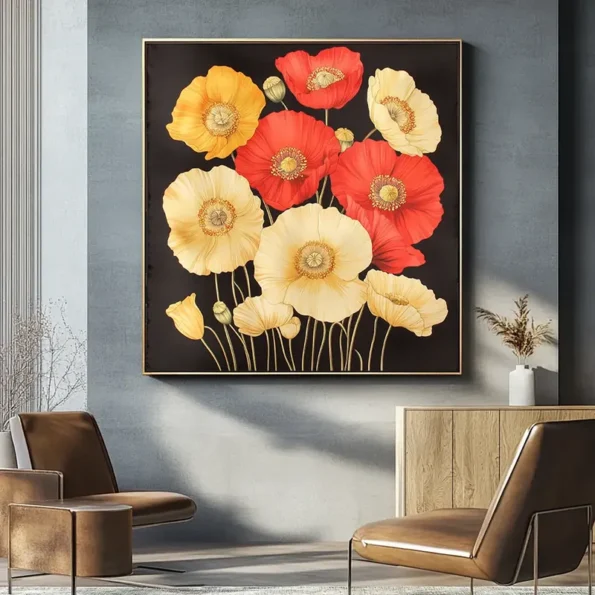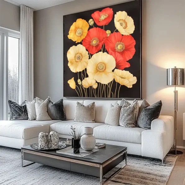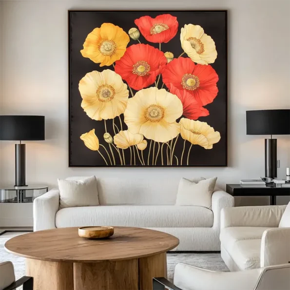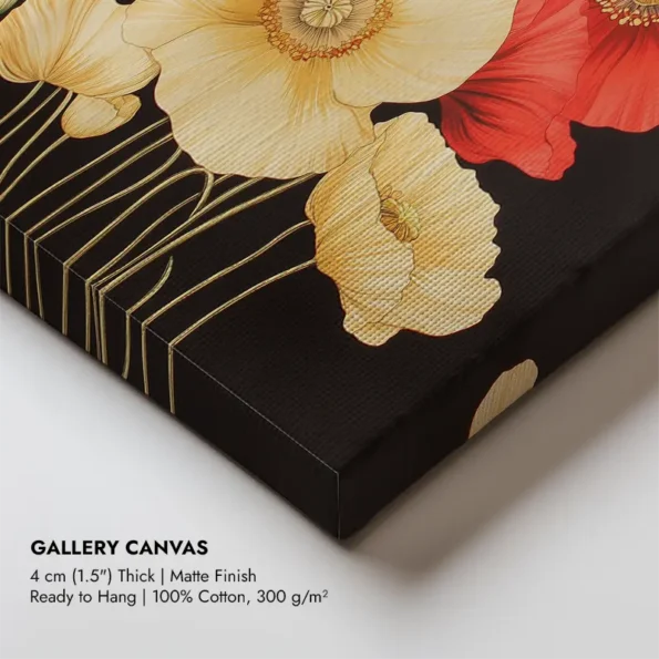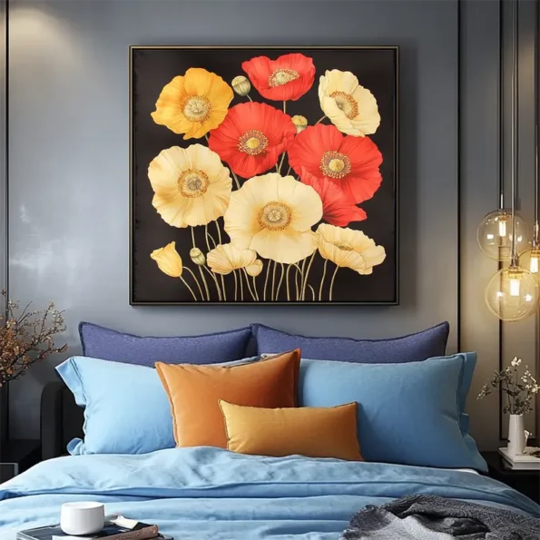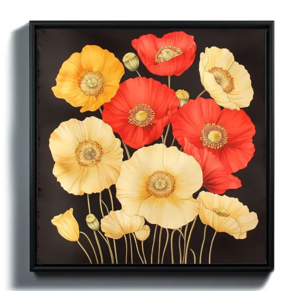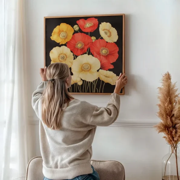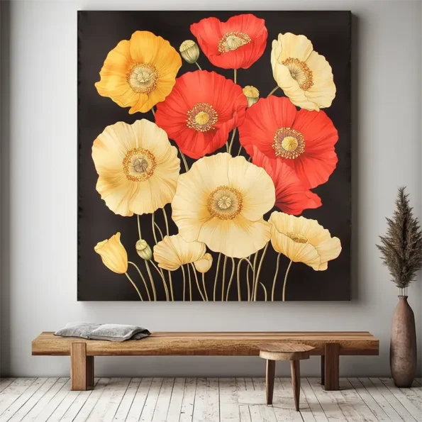 Bright red and soft yellow poppy flowers fill the canvas with life. This vibrant decor captures the beauty of nature in every detail. Perfect for those who want their space to feel fresh and colorful, this art piece brings joy to any room. The gallery-wrapped canvas is made with fade-resistant inks, ensuring the flowers remain bright over time. Ideal for living rooms, bedrooms, or offices, it adds a lovely touch without overwhelming the space. Enjoy the natural beauty that this colorful canvas offers, ready to hang in your home for an instant uplift.