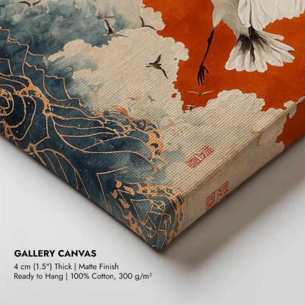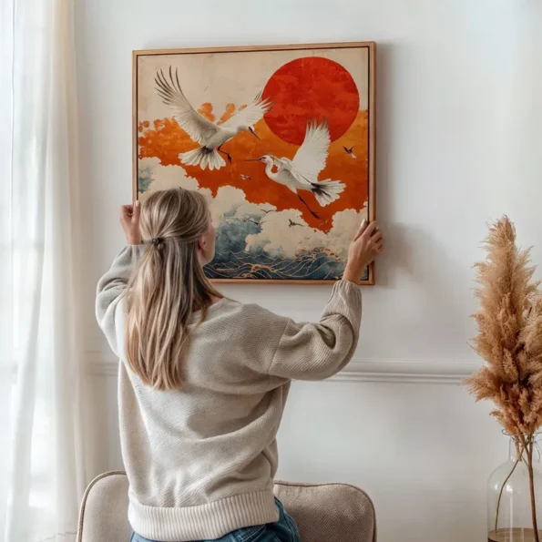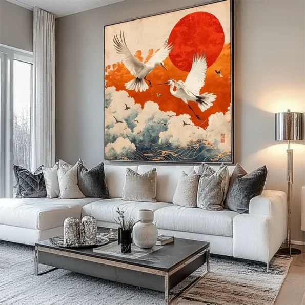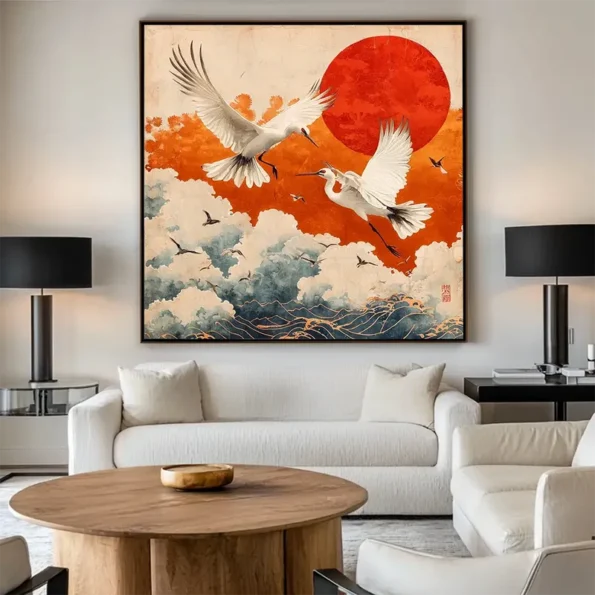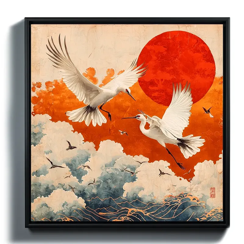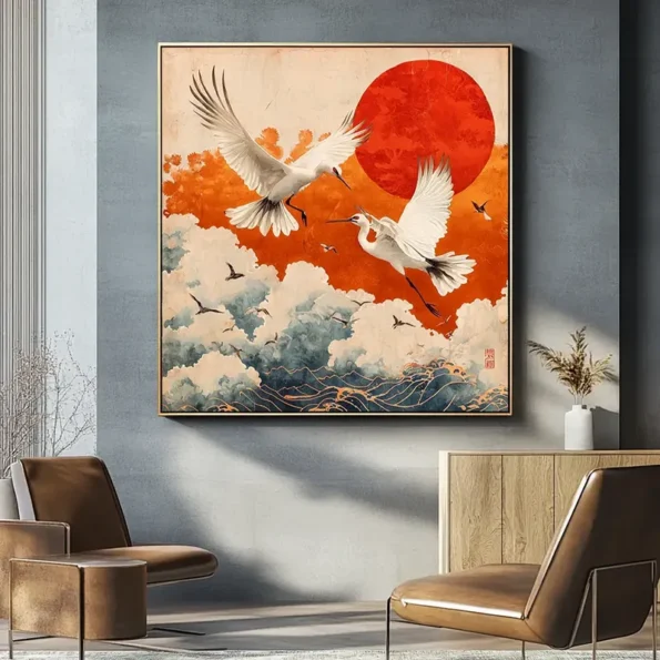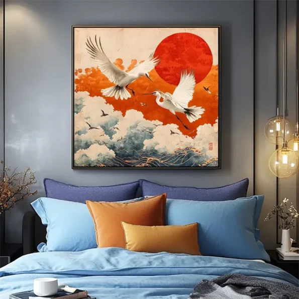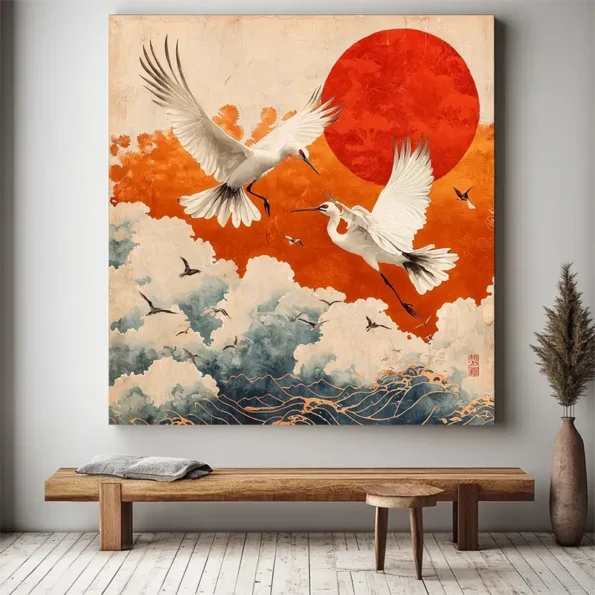 Gentle brushstrokes capture the beauty of cranes in flight. This crane wall art adds a serene touch to your home. The Japanese style canvas brings cultural elegance to any space. Perfect for those who appreciate tranquil decor. The rich red sun complements the calm blue waves, creating a harmonious atmosphere. This artwork transforms any room into a peaceful escape, making it ideal for a living room or bedroom. Made with gallery-wrapped canvas and fade-resistant inks, it’s ready to hang and showcase your love for art. European handmade craftsmanship ensures a quality piece that brings nature indoors.
