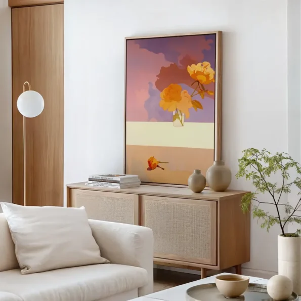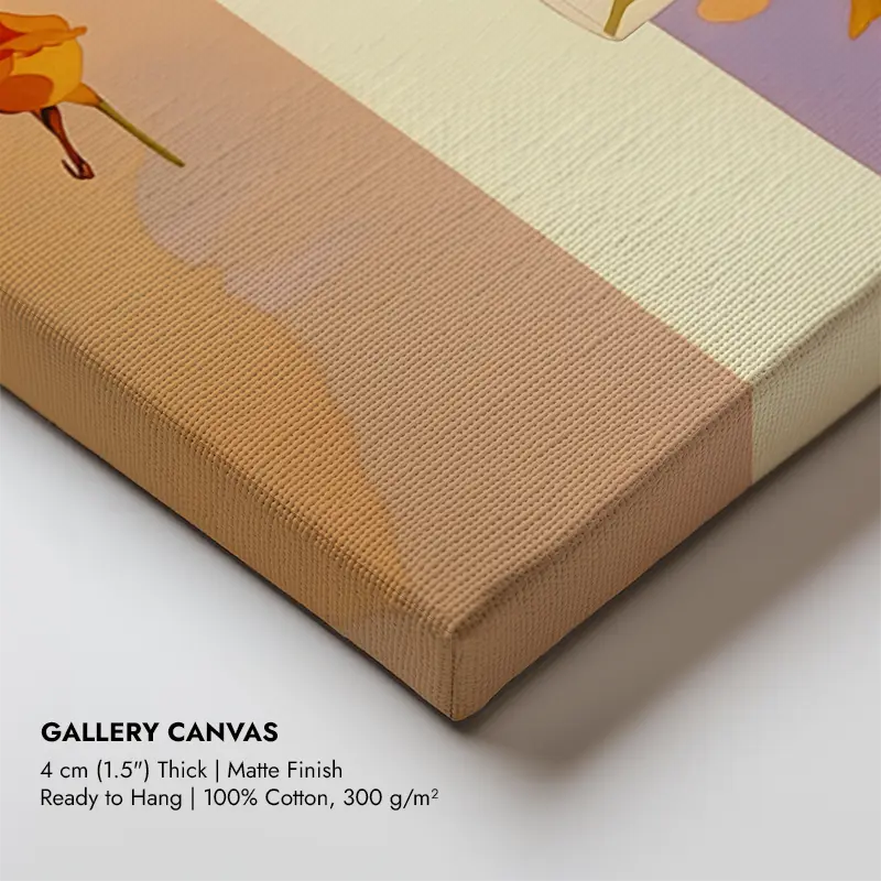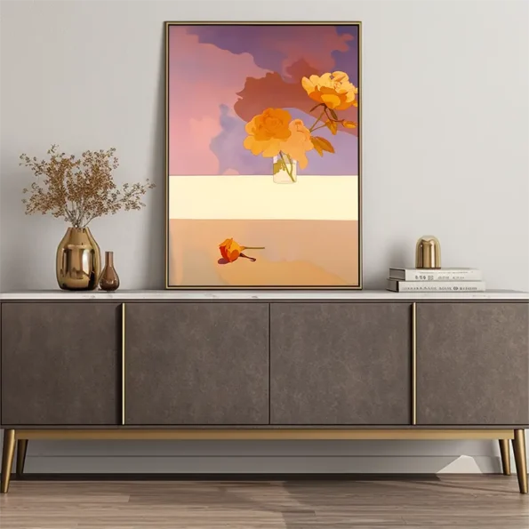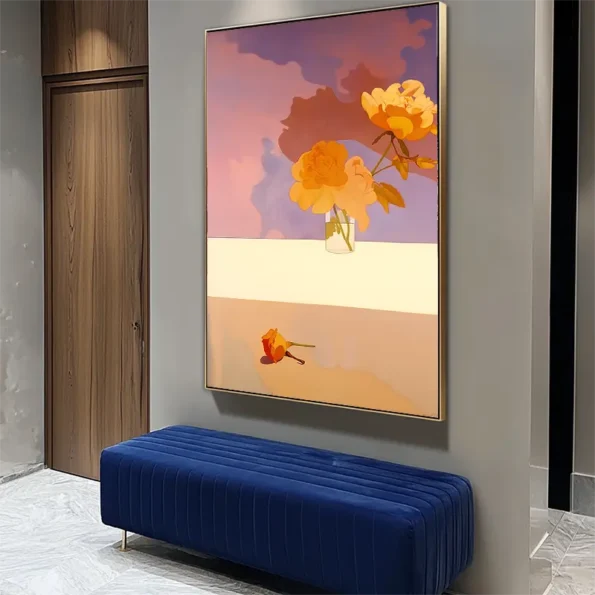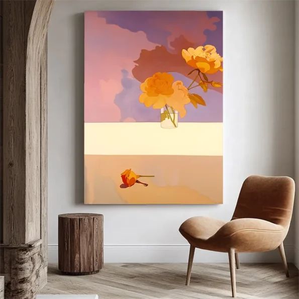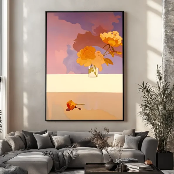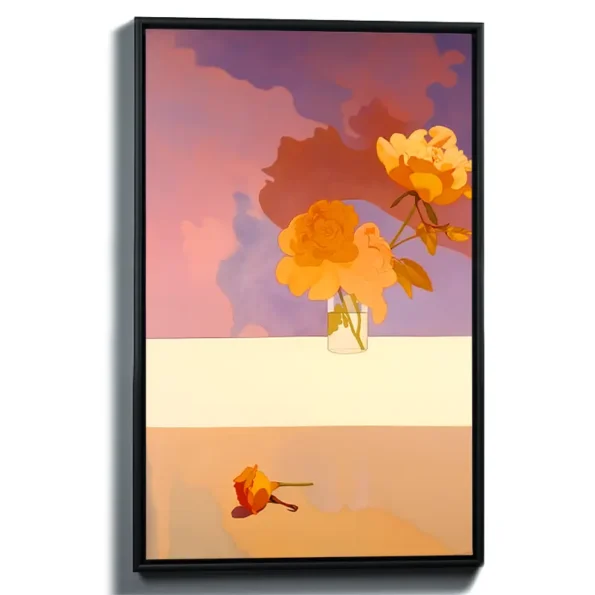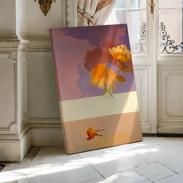 Soft light brings a sense of calm with this delicate depiction of yellow roses in a glass vase against a dreamy purple background. The art showcases bold shapes and fluid brush strokes, creating an emotional connection that resonates with floral lovers. Perfect for anyone looking to add a touch of warmth and elegance to their space. This gallery-wrapped canvas features fade-resistant inks, ensuring the beautiful colors stay vibrant over time. Ideal for living rooms, bedrooms, or office spaces, this piece is ready to hang and instantly enhance your decor.