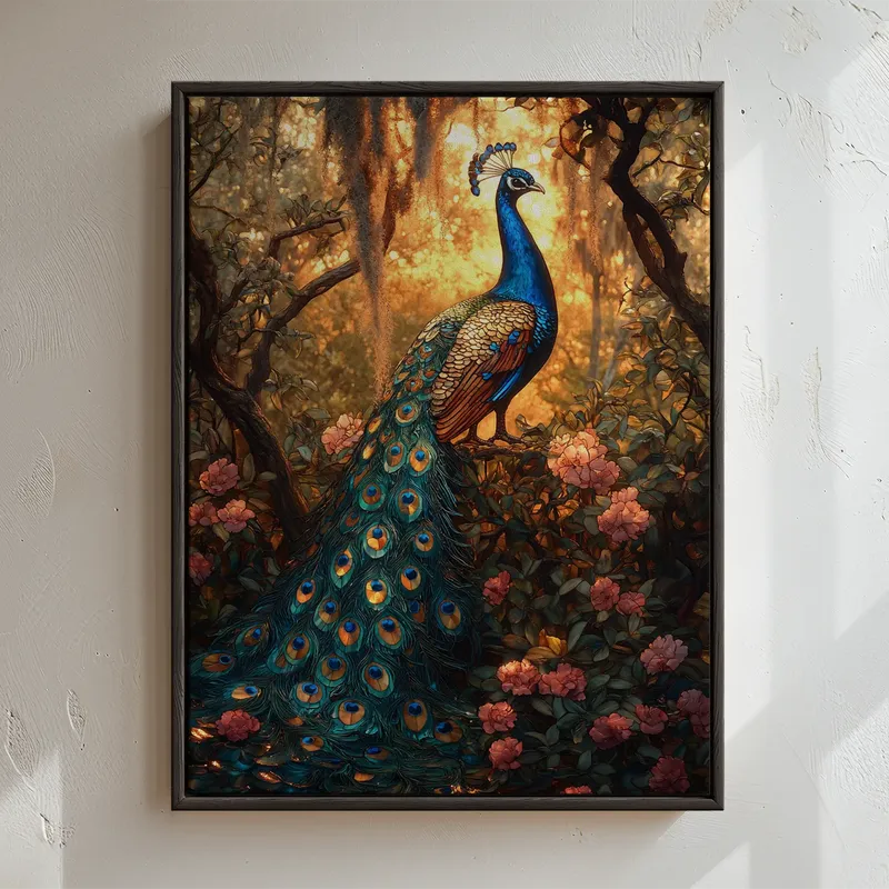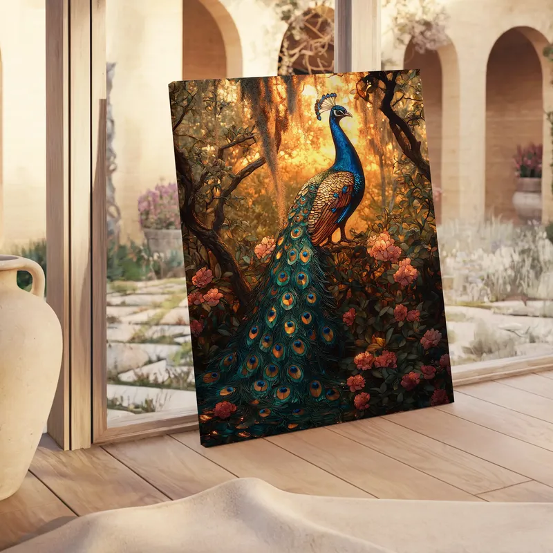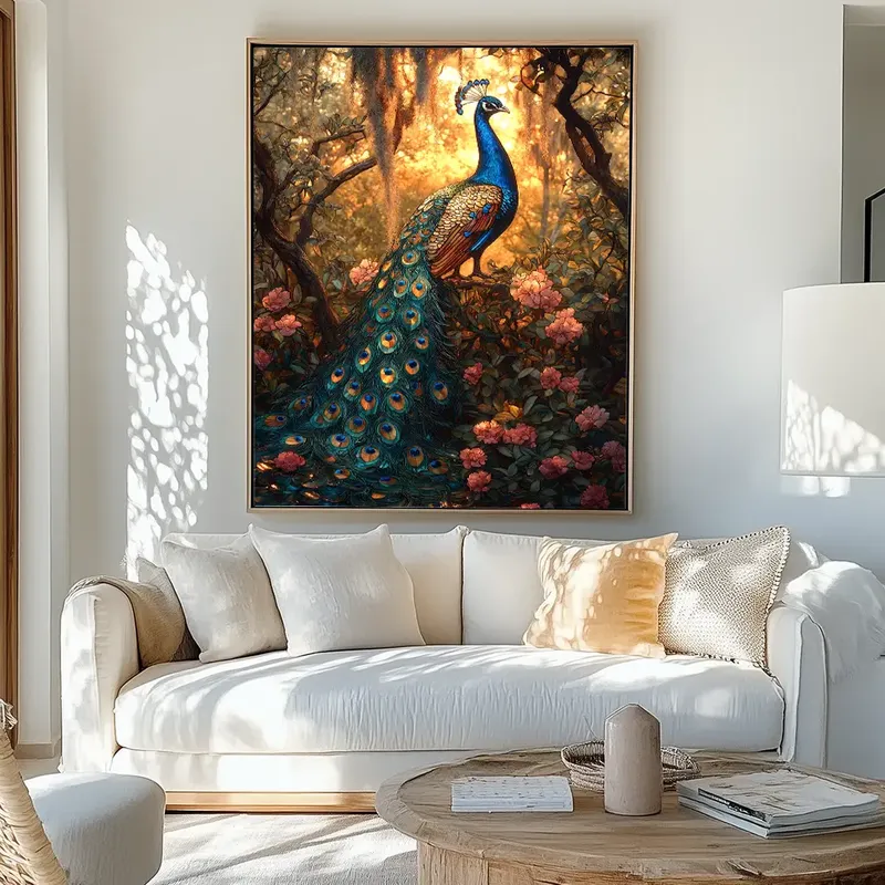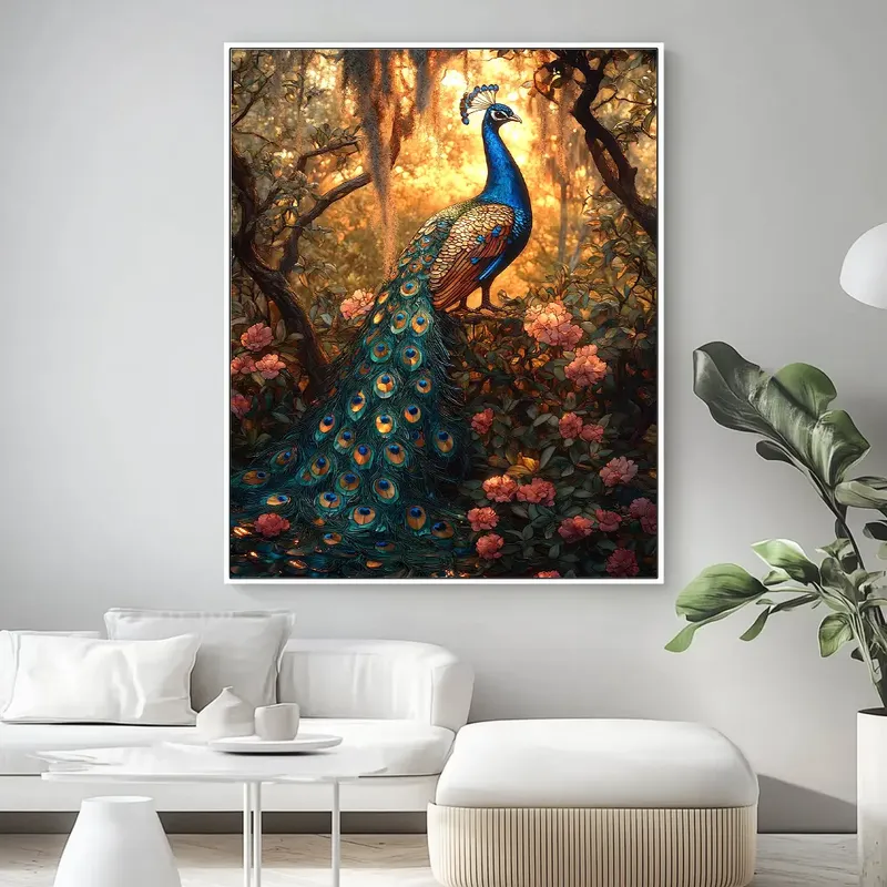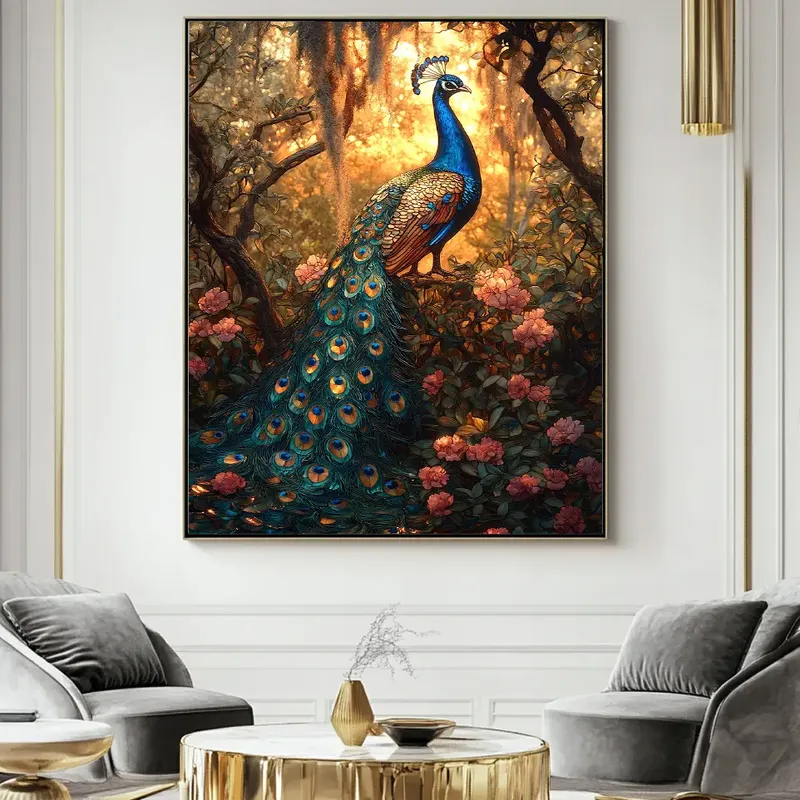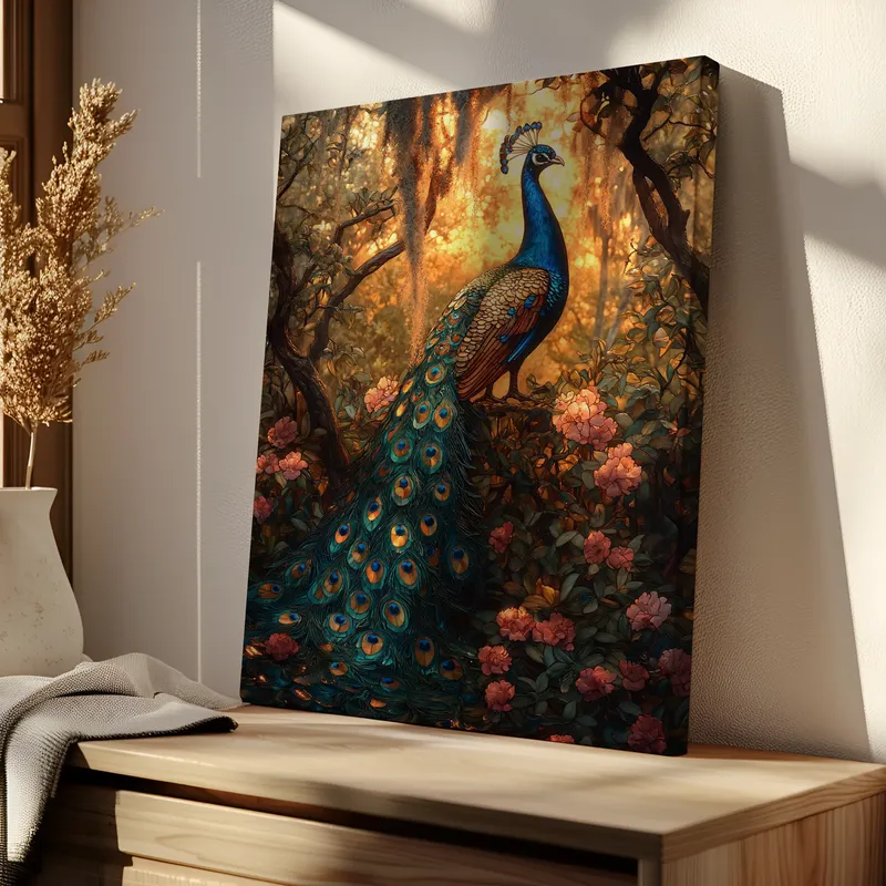 A stunning scene captures a majestic bird in nature. The peacock wall art brings a serene vibe to any space. Its vibrant colors, especially the blues and greens, create a focal point. This realistic canvas art will be perfect for those who love nature decor. The colorful floral art gently complements the peacock, enhancing the beautiful atmosphere of your room. Ideal for living rooms, bedrooms, or offices, this piece adds warmth and style to any environment. With fade-resistant inks and gallery-wrapped canvas, it’s ready to hang and impress all who see it. Bring the beauty of nature indoors with this enchanting piece.