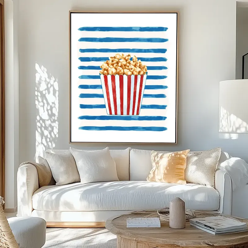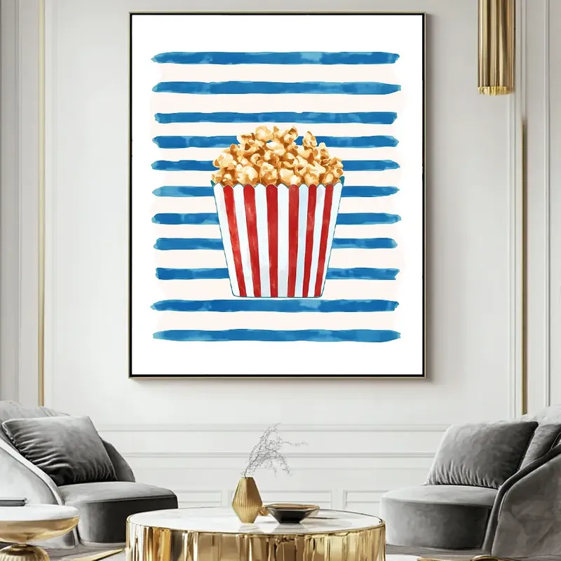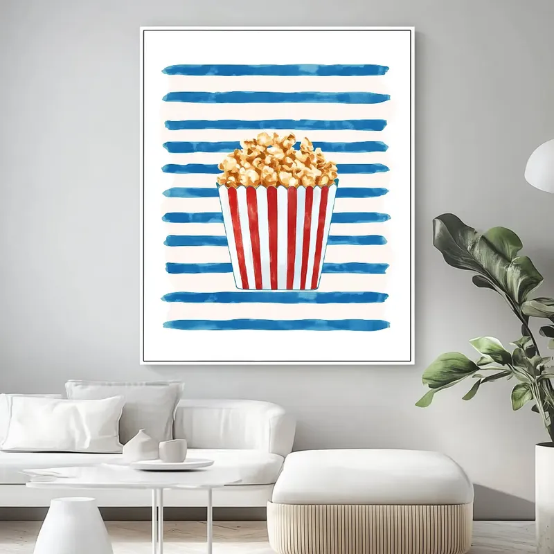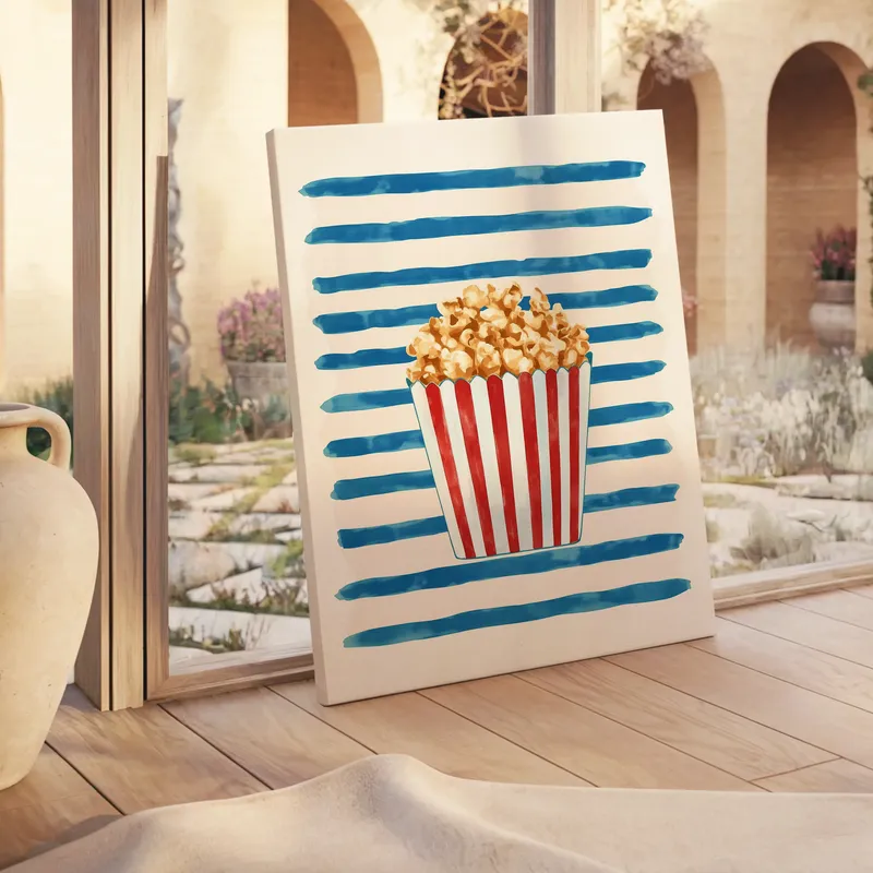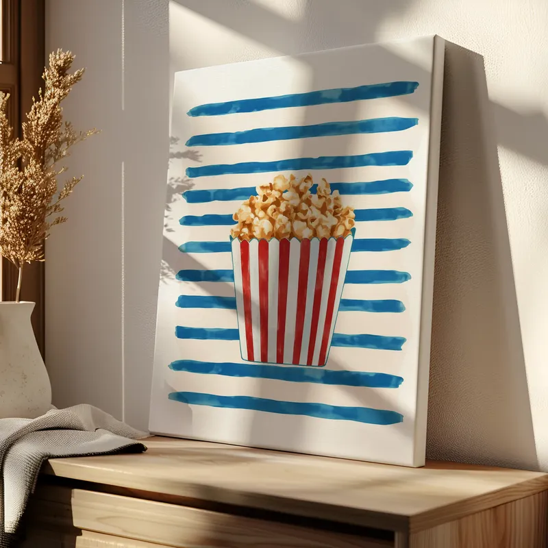 A colorful scene showcases the joy of popcorn in this playful canvas wall art. Perfect for adding fun decor to any space, this piece features a charming popcorn box against vibrant blue stripes. It makes a great addition to kitchens, dining rooms, or home theaters. The artwork invites laughter and light-heartedness, creating a delightful atmosphere that everyone can enjoy. With gallery-wrapped canvas and fade-resistant inks, this art adds a cheerful touch to your wall. Ideal for popcorn lovers, this art brings energy to your living area or entertainment space. Ready to hang, it’s a beautiful piece that combines modern style with a touch of nostalgia. Each canvas is European handmade, ensuring quality and detail.